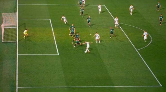 第25分钟,阿斯拉尼直塞,邓弗里斯接球兜射,皮球偏出左侧底线。