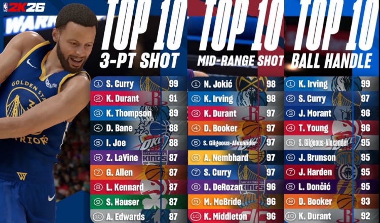 数据显示:三分能力达到99分(全联盟最高)、中距离投篮97分(仅次于约基奇和欧文的98分)、控球能力97分(略低于欧文的99分)。