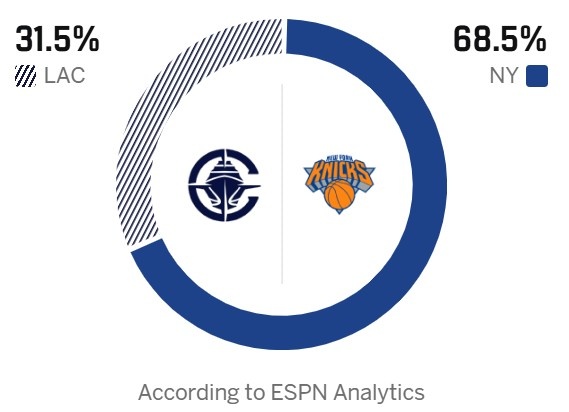 今天,ESPN预测本场胜率,尼克斯68.5%,快船31.5%。